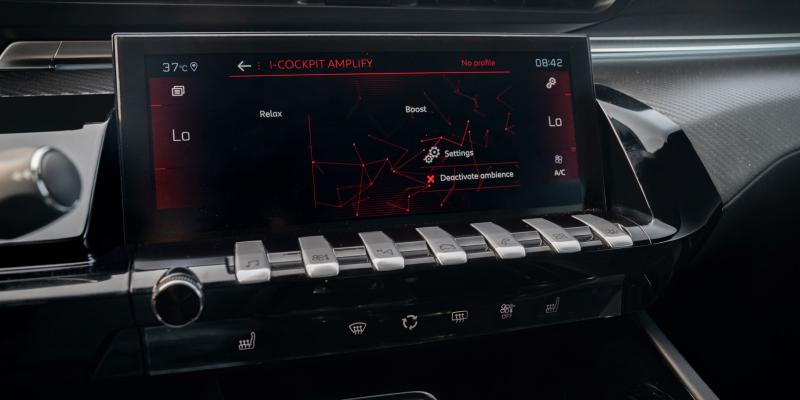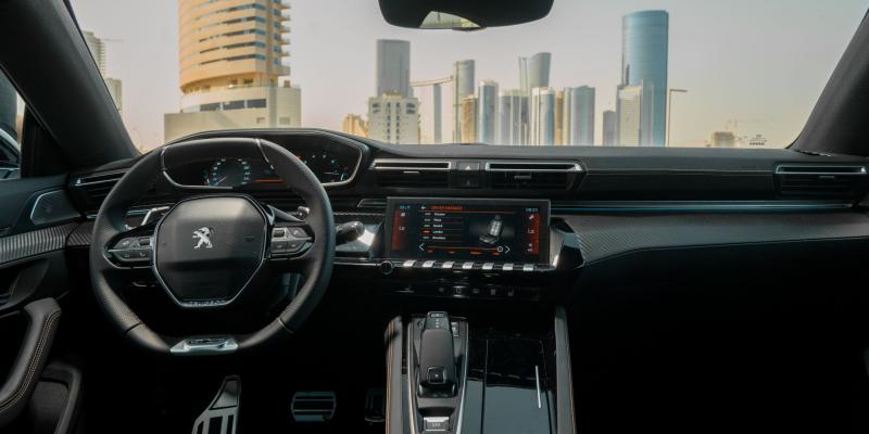وتتمحور لوحة القيادة في بيجو 508 حول الجيل الثالث الأحدث من نظام Peugeot i-Cockpit®. ويشتمل هذا النظام على عجلة قيادة مدمَجة، شاشة لمس عالية الدقّة HD قياس 8-10 بوصات، ووحدة عرض رأسية (HUD) مع شاشة رقمية عالية الوضوح قياس 12.3 بوصة. وتتضمن شاشة اللمس الوسطية سبعة مفاتيح مشابهة لمفاتيح البيانو يتم من خلالها تشغيل الوظائف الأساسية لأنظمة الراديو، مكيّف الهواء، الملاحة، ضبط وضعيات السيارة، الهاتف، انعكاس الهاتف، ونظام i-Cockpit® Amplify في فئة تجهيزات GT-Line، الذي يوفر خياراً من بين بيئتين مختلفتين يمكن تخصيصهما بالكامل: Boost وRelax، من خلال تعديل كثافة الإنارة المحيطية ولون الشاشة وتعديل وضعيات الموسيقى المحيطية، وبرامج التدليك المتعدّدة النقاط. كما يمكن تخصيص وحدة عرض i-Cockpit® الرأسية بشكل كامل من خلال ست وضعيات عرض مختلفة، وهي موجودة فوق عجلة القيادة وتقدّم معلومات حول القيادة ضمن خط نظر السائق.