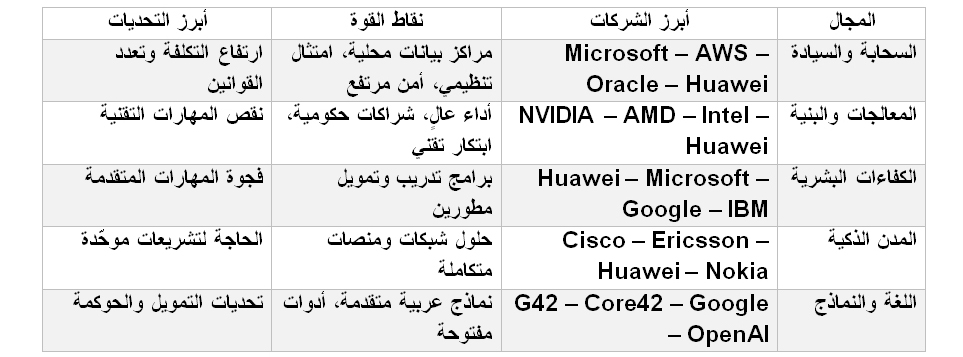 من يملك القدرة الحسابية يملك المستقبل. فقد أعلنت NVIDIA عن تزويد السعودية بـ 18 ألف شريحة   Blackwell GPU   لتأسيس “مصانع ذكاء وطني”، بينما وقّعت AMD  اتفاقاً مع شركة HUMAIN بقيمة 10 مليارات دولار لإنشاء مراكز بيانات مفتوحة الاعتماد. كما أطلقت Intel  حلول Gaudi3 عبر شراكات سيادية مع الإمارات، في حين تسعى Huawei (Ascend) وAlibaba (Yitian)  إلى تطوير معالجات محلية لتقليل الاعتماد على الولايات المتحدة.