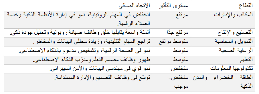 - هناك انتقال صافي: خلق وظائف جديدة (في تحليل البيانات، هندسة الذكاء الاصطناعي، الأمن السيبراني، الطاقة الخضراء) مع تعرّض وظائف تقليدية للخطر أو التحول.