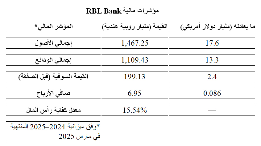 يُعد بنك RBL Bank، المعروف سابقاً باسم بنك راتناكار، أحد أقدم البنوك الخاصة في الهند، ويُصنف حالياً في المرتبة الثالثة عشرة بين المصارف الخاصة من حيث الأصول التي بلغت اكثر من 17.6 مليار دولار في نهاية مارس 2025، مع طموح واضح للصعود إلى المراتب الخمس الأولى. ووصلت قيمة البنك السوقية الى حدود 2.4 مليار دولار اميركي قبل عملية الاستحواذ. ويمتلك البنك اليوم شبكة تتألف من 564 فرعاً وأكثر من 1,300 مركز خدمات تغطي معظم الولايات الهندية، وتخدم أكثر من 15.5 مليون عميل.