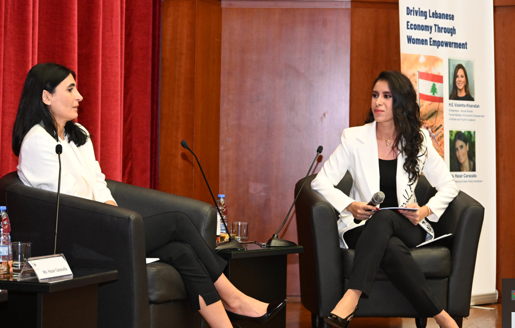 واستضافت الندوة الوزيرة السابقة للتمكين الاقتصادي للنساء والشباب في لبنان فيوليت خيرالله الصفدي، والخبيرة في الاقتصاد والسياسات العامة السيدة هزار كركلا، بحضور أمين عام الجامعة د.عمر حوري، وعميد الكلية البروفيسور محمد أبو النجا، ومساعدة العميد البروفيسور هنادي طاهر، وحشد أكاديمي وإداري وطلابي.