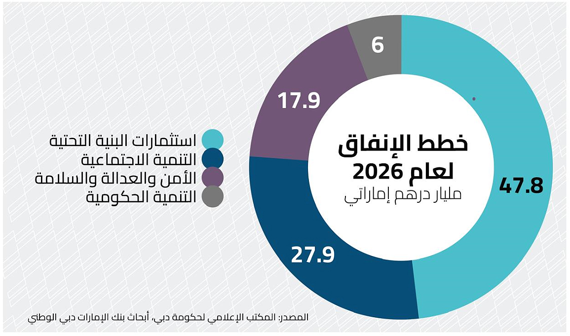 وتظهر الميزانية تركيزاً كبيراً في الإنفاق على البنى التحتية التي تستحوذ على 48 في المئة من الإنفاق المرصود لعام 2026، أي ما قيمته 47.8 مليار درهم، بزيادة كبيرة قدرها 20.4 في المئة عن ميزانية 2025. وحسب البيان الذي أصدرته حكومة دبي للإعلان عن الميزانية، ستذهب النفقات المخصصة للبنى التحتية لتمويل مشاريع طرقات وجسور وأنفاق والنقل العام وشبكات الصرف الصحي والطاقة المتجددة وإدارة النفايات. وتشير بعض المصادر بأن هناك حالياً مشاريع قيد التنفيذ في دبي بقيمة 114 مليار درهم. ويتماشى التوسع في الإنفاق على البنى التحتية مع هدف تحويل دبي الى إحدى المدن الرئيسية عالمياً وزيادة عدد السكان الى 5.8 ملايين مع حلول عام 2040 من نحو 4 ملايين حالياً. وتتضمن مشاريع البنى التحتية بناء خطوط جديدة للمترو. وكل هذه المعطيات تشير الى أن الموازنة المعلنة هي توسعية بكافة المقاييس وستساعد على تسريع النمو الاقتصادي في عام 2026 وما بعده.