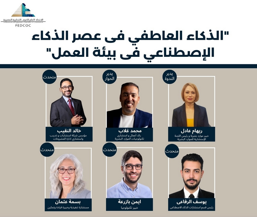 أوصت ندوة "الذكاء العاطفي في عصر الذكاء الإصطناعي في بيئة العمل" التي نظمتها اللجنة الاستشارية للموارد البشرية بالاتحاد العام للغرف التجارية برئاسة ريهام عادل تحت رعاية وبحضور احمد الوكيل رئيس الاتحاد ، بضرورة تعزيز مهارات الذكاء العاطفي لدى القادة وتطوير الثقافة المؤسسية لتعطي الأولوية للعلاقات الإنسانية ودمج الذكاء الإصطناعي بطريقة تدعم الإنسان لا تستبدله.