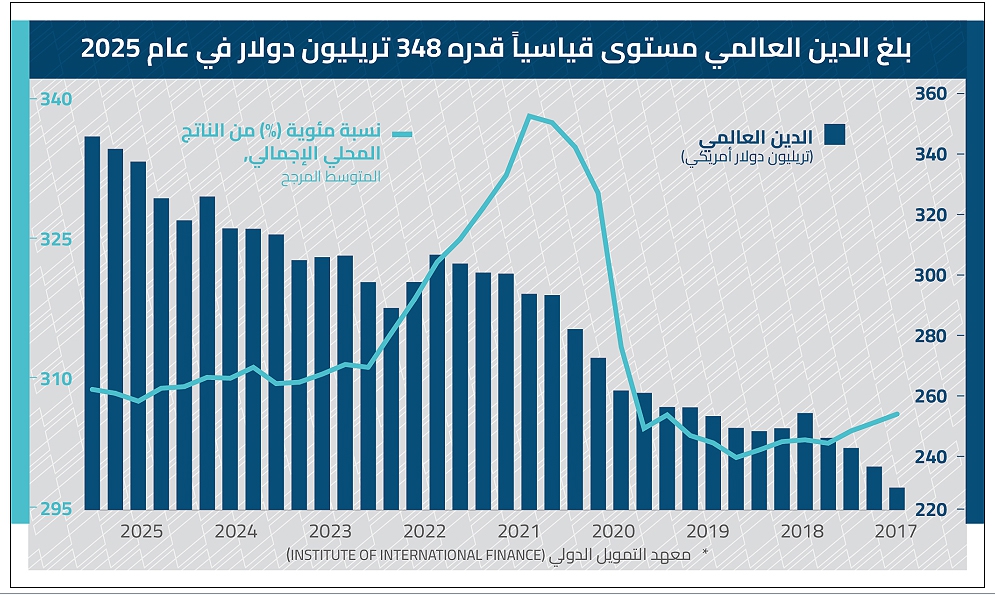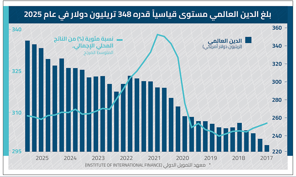 يشهد الاقتصاد العالمي مرحلة غير مسبوقة من التوسع في المديونية، ليس فقط من حيث الحجم القياسي الذي بلغه، بل من حيث طبيعة القوى التي تقف وراءه واتجاهاته المستقبلية. ويشير تقرير "مرصد الدين العالمي"، الصادر عن معهد التمويل الدولي في فبراير 2026، إلى ارتفاع إجمالي الدين العالمي إلى نحو 348 تريليون دولار في نهاية عام 2025، بعد زيادة تقارب 29 تريليون دولار خلال عام واحد، وهي أكبر قفزة سنوية منذ فترة الجائحة.