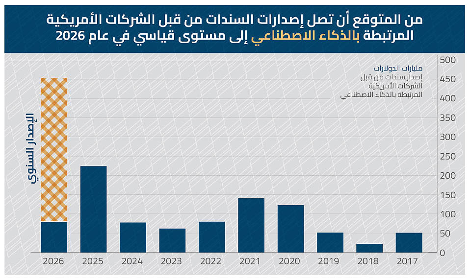 من بين أبرز التحولات التي يرصدها التقرير بروز الذكاء الاصطناعي كمحرك رئيسي للتمويل العالمي، حيث تظهر البيانات أن إصدارات السندات للشركات المرتبطة بالذكاء الاصطناعي في الولايات المتحدة ارتفعت بشكل حاد خلال العام 2025، حيث قفزت إلى نحو 220 مليار دولار، بعد أن كانت دائماً خلال السنوات الأخيرة أقل من 150 مليار دولار سنوياً، مع توقعات بأن تقترب من مستوى يتراوح بين 450 و500 مليار دولار على أساس سنوي في 2026، وهو مستوى قياسي تاريخي لهذا القطاع.