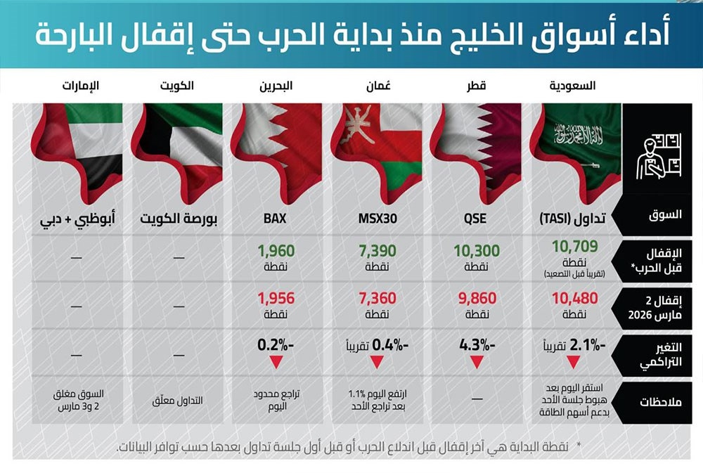 أما في بقية المنطقة، فقد ظهرت تباينات لافتة في حجم التأثير. السوق القطرية سجلت أكبر تراجع حتى الآن، حيث انخفض المؤشر إلى نحو 9,860 نقطة، أي ما يقارب 4.3- في المئة منذ بداية التداول بعد الحرب، وهو هبوط يعكس تسعيراً متأخراً نسبياً بسبب العطلة السابقة. في المقابل، كان التأثير أكثر محدودية في كل من عُمان والبحرين، حيث أغلق مؤشر مسقط قرب 7,360 نقطة بتراجع طفيف يقارب 0.4- في المئة تراكمي، بينما استقر مؤشر البحرين حول 1,956 نقطة بانخفاض هامشي لا يتجاوز -0.2 في المئة. أما أسواق أبوظبي ودبي فقد بقيت مغلقة اليوم ضمن قرار الإغلاق المؤقت ليومي 2 و3 مارس، ما يعني أن ردّة الفعل السعرية الكاملة لم تظهر بعد، بل تم تأجيلها إلى موعد إعادة الفتح، وهو ما قد يترجم إلى تقلبات أعلى عند استئناف التداول. وبالمثل، استمر تعليق التداول في بورصة الكويت حتى إشعار آخر، أي إن هذه السوق لم تُسعّر نتائج الحرب بعد بصورة مباشرة. هذه الأوضاع مجتمعة تؤكد أن ردّة الفعل الإقليمية لم تتخذ طابعاً موحداً، بل تأثرت بتركيبة كل سوق ووزن قطاعاته ومدى انكشافه على النشاط الاقتصادي المباشر، إضافة إلى القرارات التنظيمية الخاصة بكل دولة.