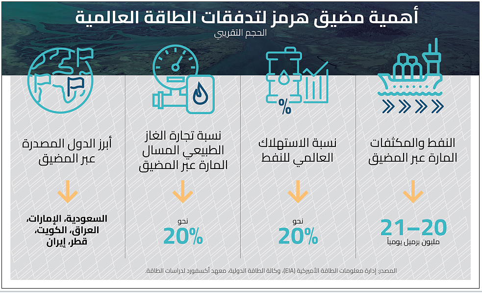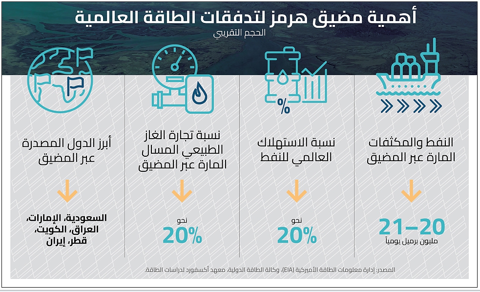 يمر عبر المضيق يومياً ما يقارب 20 إلى 21 مليون برميل من النفط الخام والمكثفات، أي نحو خُمس الاستهلاك العالمي من النفط، وفق تقديرات إدارة معلومات الطاقة الأميركية ووكالة الطاقة الدولية. كما يعبره جزء كبير من صادرات الغاز الطبيعي المسال من قطر، أحد أكبر مصدري الغاز في العالم. ولهذا السبب فإن أي اضطراب في الملاحة عبر هذا الممر لا يبقى حدثاً إقليمياً، بل يتحول سريعاً إلى اختبار مباشر لاستقرار الاقتصاد العالمي.