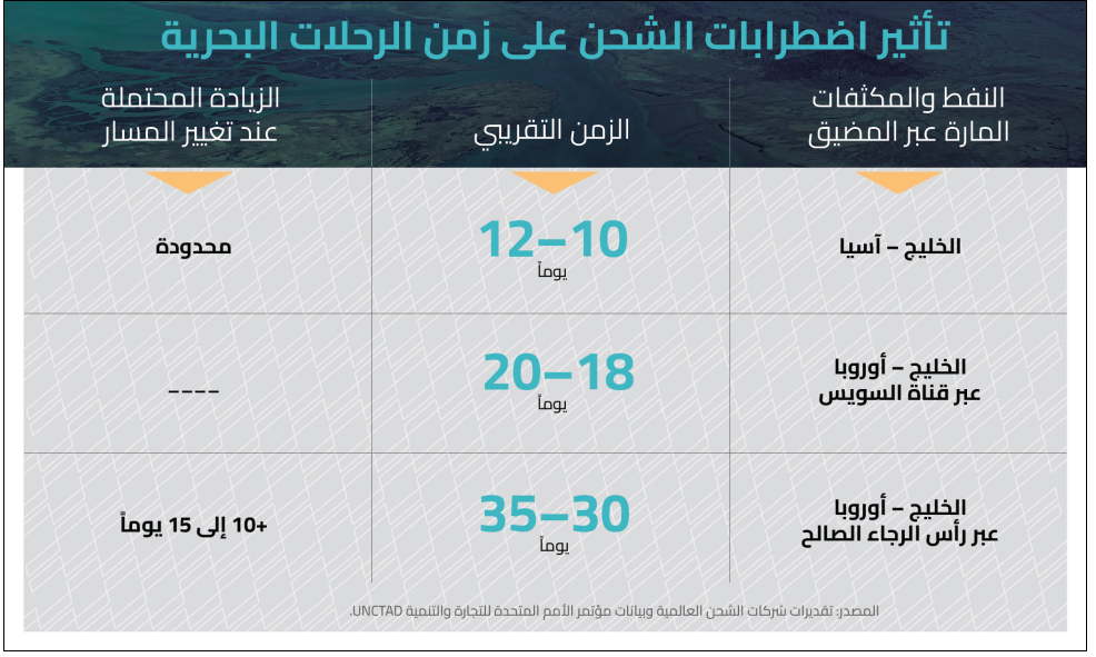 لكن تغيير المسار قد يكون أكثر كلفة مما يبدو. فالسفن التي تضطر إلى الالتفاف عبر رأس الرجاء الصالح بدلاً من المرور عبر المسارات التقليدية قد تضيف ما بين 10 و15 يوماً إلى زمن الرحلة بين آسيا وأوروبا. وهذا التأخير لا يرفع تكاليف الوقود فحسب، بل يؤدي أيضاً إلى نقص في الحاويات المتاحة عالمياً.