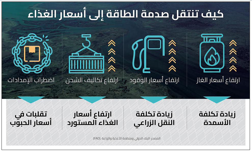 وتشير تقديرات البنك الدولي إلى أن الطاقة والخدمات اللوجستية تمثلان نحو 60 في المئة من تكاليف إنتاج الغذاء العالمية. لذلك فإن صدمات الطاقة لا تتوقف عند محطات الوقود، بل تمتد تدريجياً إلى أسعار المواد الغذائية الأساسية.