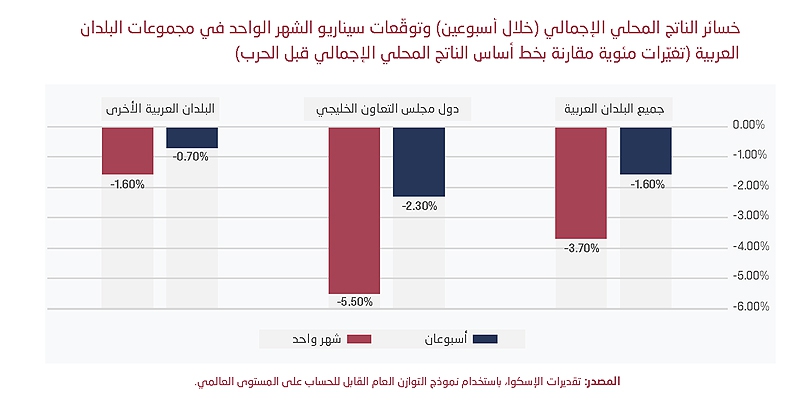 أعلن بيان صحافي صادر عن الإسكوا أن النزاع في المنطقة فرض تكلفة اقتصادية عالية على كافة المنطقة العربية، حيث تشير التقديرات الأولية إلى خسائر إقليمية بلغت حوالى 63 مليار دولار في أول أسبوعين. هذا ما تظهره دراسة جديدة للجنة الأمم المتحدة الاقتصادية والاجتماعية لغربي آسيا (الإسكوا) تحت عنوان "الصراع وتداعياته: تصاعد حدة الأزمة في المنطقة العربية"، تحذر فيها من أنّ الخسائر، في حال تواصل النزاع مدة شهر، قد تصل إلى حوالي 150 مليار دولار أو ما يعادل 3.7% من الناتج المحلي الإجمالي الإقليمي.