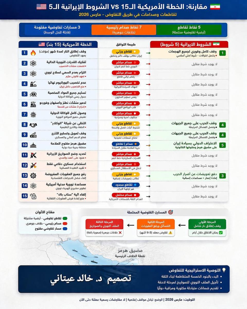 نقاط التقاطع الجزئية تظهر في البنود المتعلقة بوقف الحرب ورفع العقوبات، ما يشير إلى أن هناك أرضية محتملة للتفاوض حول مسائل إنسانية واقتصادية وأمنية محدودة. لكن الصدام في القضايا النووية والصاروخية والجيوستراتيجية يشكل عقبة جوهرية قد تطيل مسار المفاوضات، ويؤكد أن أي اتفاق مستقبلي سيكون نتيجة مساومة دقيقة تتطلب تسهيلات متبادلة وضمانات دولية قوية لضمان التنفيذ والتقليل من مخاطر الاستفزازات أو الانتهاكات لاحقًا.