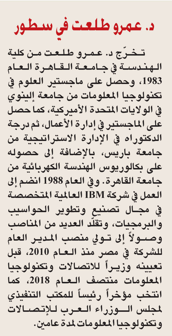 منذ تولّيه منصب وزير الاتصالات وتكنولوجيا المعلومات في مصر منتصف العام الماضي، ينصبّ تركيز د. عمرو طلعت، الملقب بـ «دينامو IBM» على محورين رئيسيين: الأول هو بناء الإنسان المصري عبر تسهيل تعاملاته اليومية وتحسين مستوى معيشته من خلال التكنولوجيا وتطبيقاتها المتنوعة، إلى جانب برامج دعم وتأهيل وتدريب الشباب المصري. أما المحور الثاني فهو التحول الرقمي، من خلال مكننة كافة مؤسسات الدولة ونشر مفهوم المعاملات الرقمية مثل الدفع الإلكتروني والتجارة الإلكترونية وغيرهما، بما يساهم في تحسين مستوى الخدمات المقدمة للمواطنين، ورفع الكفاءة التشغيلية، ومكافحة الفساد المالي والإداري.