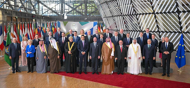 استضافت العاصمة البلجيكية بروكسل في السادس عشر من تشرين الأول/أكتوبر حدثاً تاريخياً بارزاً، تمثل في انعقاد أول قمة خليجية – أوروبية، التي جمعت رؤساء دول مجلس التعاون الخليجي مع نظرائهم من الدول الأعضاء في الاتحاد الأوروبي. تُعد هذه القمة الأولى من نوعها على مستوى القادة منذ بدء العلاقات الرسمية بين الجانبين عام 1989، وقد شهدت مشاركة 33 شخصية رفيعة المستوى. تمّ خلال القمة التداول في سبل تحقيق حلول سلمية للنزاعات الحالية، والحد من أي تصعيد قد يؤدي إلى نشوب حرب شاملة في الشرق الأوسط. كما أكدت على أهمية تعزيز التعاون في المجالات السياسية والاقتصادية والأمنية، بهدف الوصول إلى شراكة استراتيجية متكاملة تشمل مجالات الطاقة والاستثمار والتجارة، مع إيلاء أولوية قصوى لمسألة التغير المناخي كأحد أكبر التحديات التي تواجه العالم.